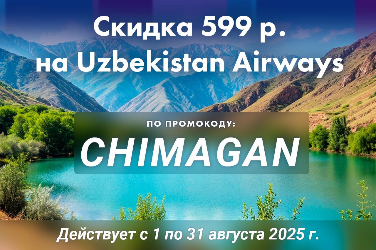 Мы только пожелаем Вам удачи, и подарим промокод «CHIMAGAN»! Применяйте его и получайте скидку 599 руб. на любой рейс Uzbekistan Airways.